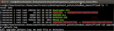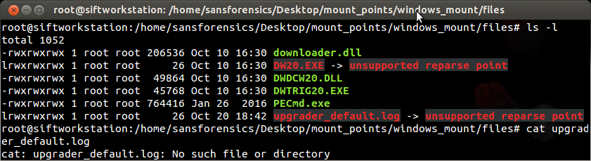 If you mount a volume containing such compressed files in SIFT Workstation or any linux system (they all use the same NTFS-3g FUSE driver), you will see the message 'Unsupported reparse point' when trying to list these files. Trying to access file contents will result in errors as seen in screenshot below.